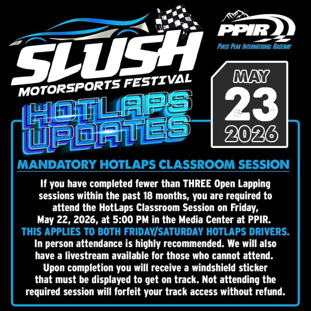 MANDATORY HOTLAPS CLASSROOM SESSION - If you have completed fewer than THREE Open Lapping sessions within the past 18 months, you are required to attend the HotLaps Classroom Session on Friday, May 22, 2026, at 5:00 PM in the Media Center at PPIR. THIS APPLIES TO BOTH FRIDAY/SATURDAY HOTLAPS DRIVERS. In person attendance is highly recommended. We will also have a livestream available for those who cannot attend. Upon completion you will receive a windshield sticker that must be displayed to get on track. Not attending the required session will forfeit your track access without refund.