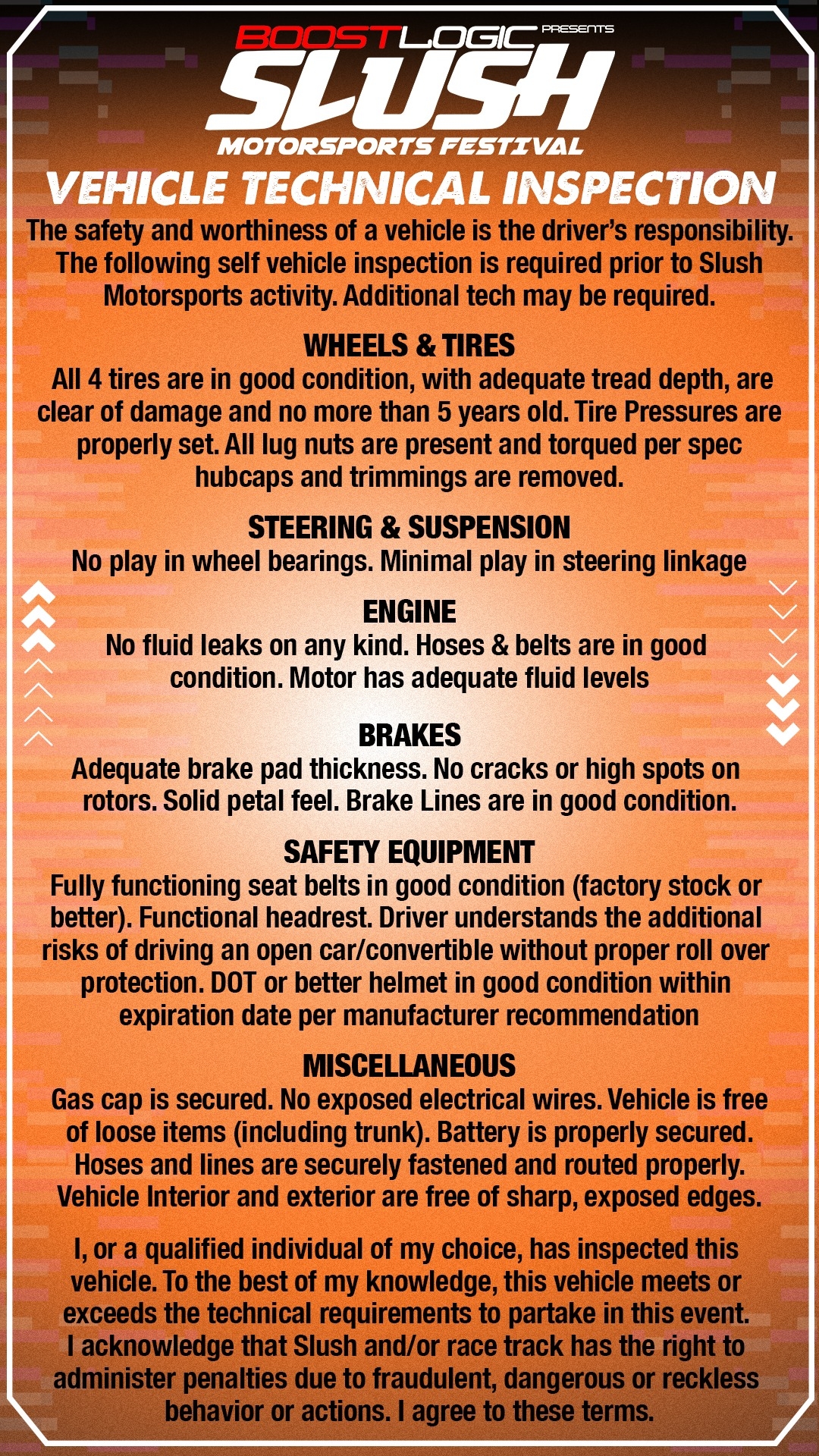 The following self vehicle inspection is required prior to Slush Motorsports activity.